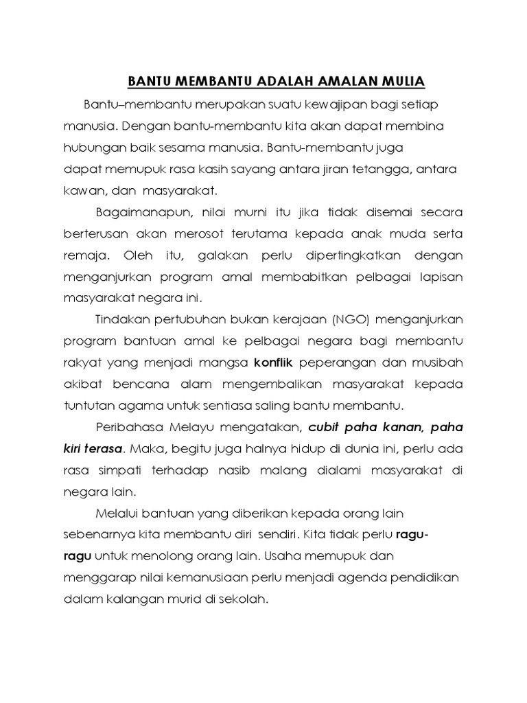 Sedangkan orang kaya yang mengeluarkan zakat akan menolong fakir miskin anak yatim dan mereka yang berhak. Dengan melakukan taawun banyak manfaat yang akan didapat. Karangan yang merangkumi pelbagai tema dan soalan dapat membantu pelajar untuk mengetahui isi-isi penting yang berkait dengan soalan yang ingin dijawab dalam latihan atau peperiksaanBerikut adalah contoh karangan usaha-usaha membantu golongan Orang Kurang Upaya OKU yang.